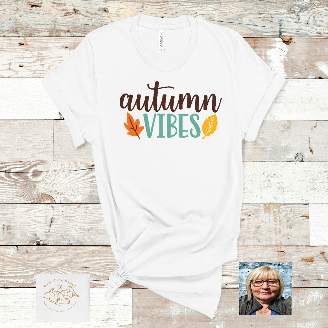 Featuring a fun saying “Autumn Vibes”, this t-shirt will become your go to t-shirt.