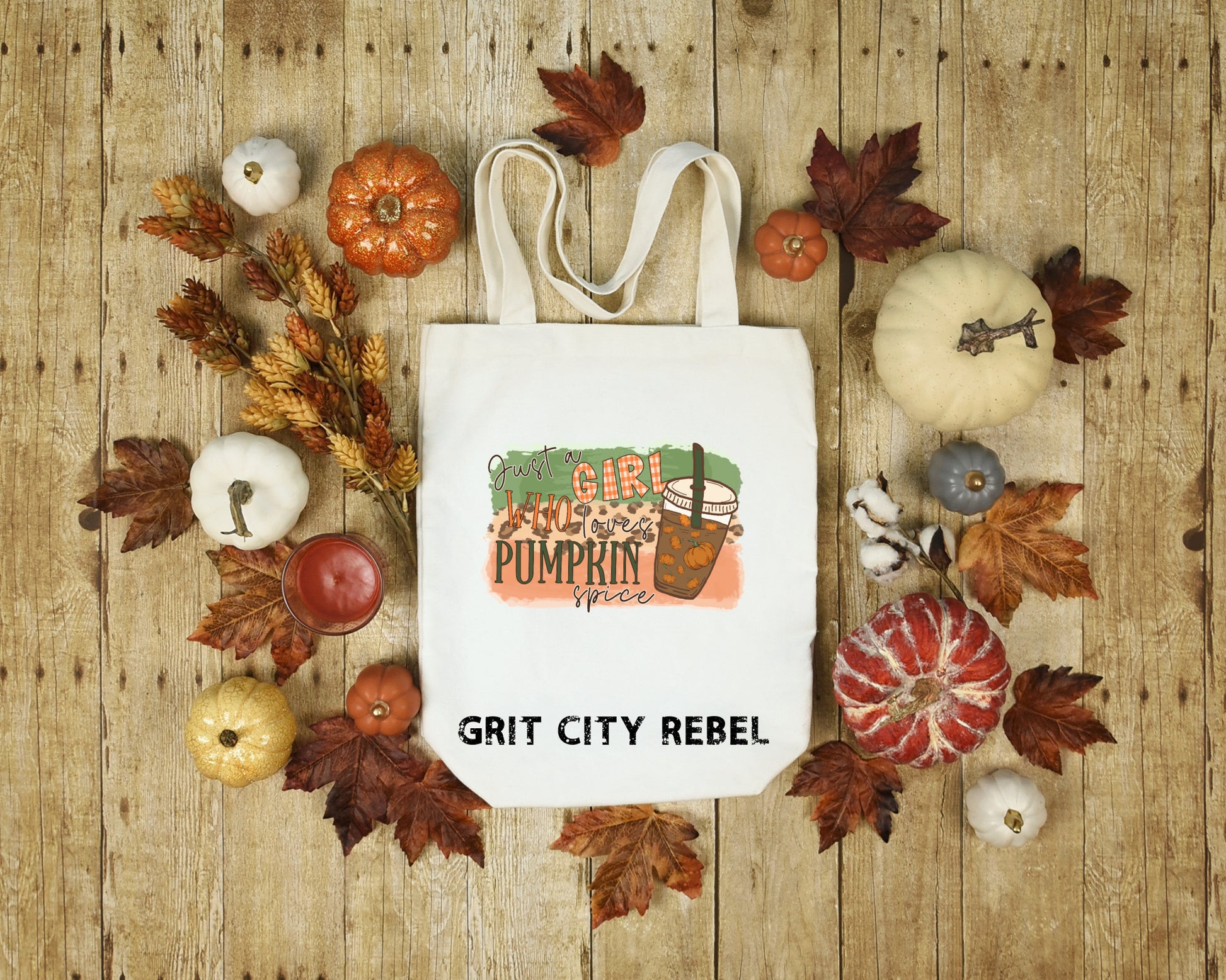 A cloth bag/tote featuring a fun saying “Just a girl who loves pumpkin” with pumpkin cup and design, this bag/tote will become a go to for shopping. The bag/tote has a lightweight feel and durable canvas material. This is approximately 14 inches by 12 inches. Please note the bag/tote does not have a flat bottom.