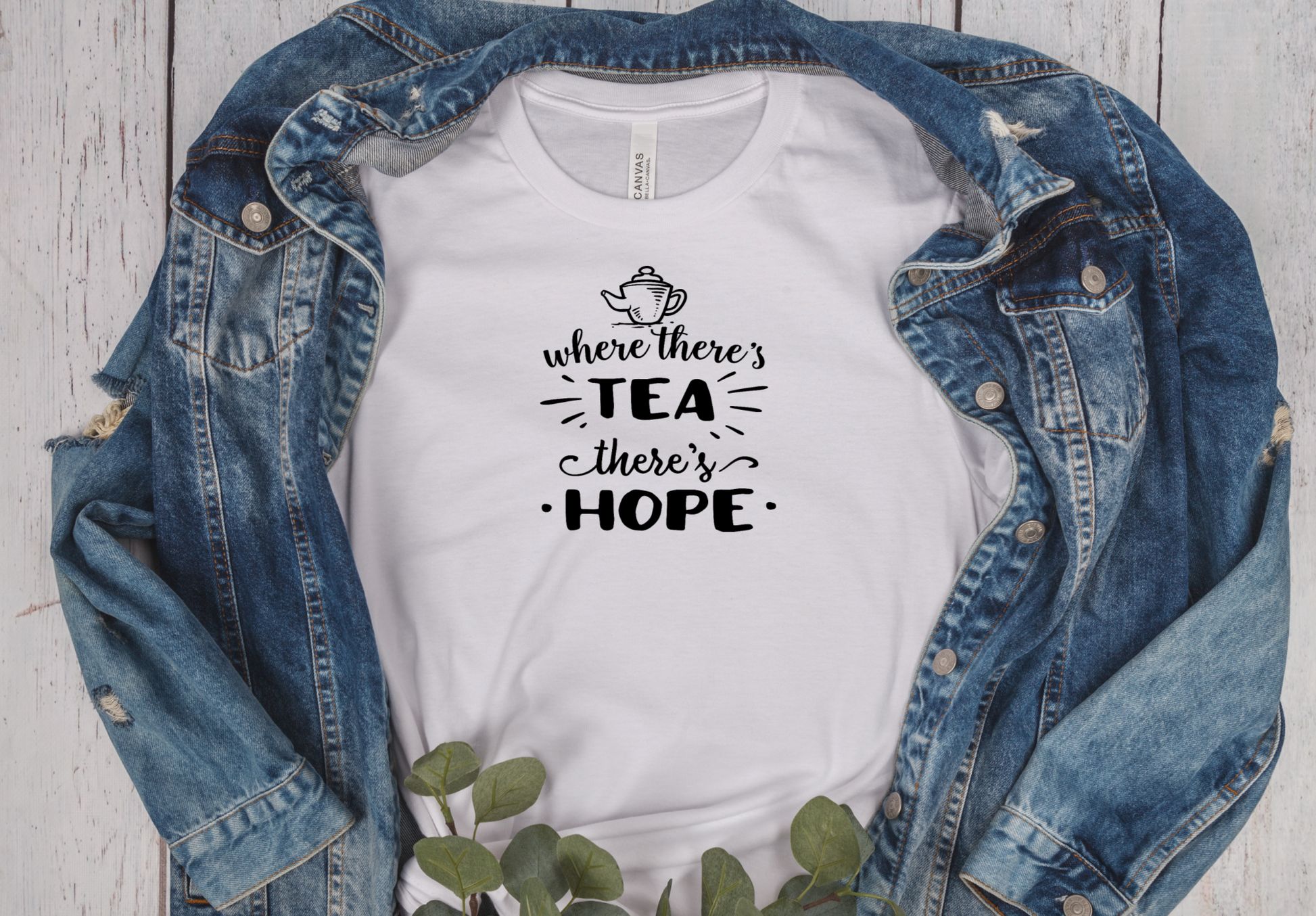 Featuring a fun saying “Where there's tea there's hope”, this t-shirt will become your go to t-shirt.
